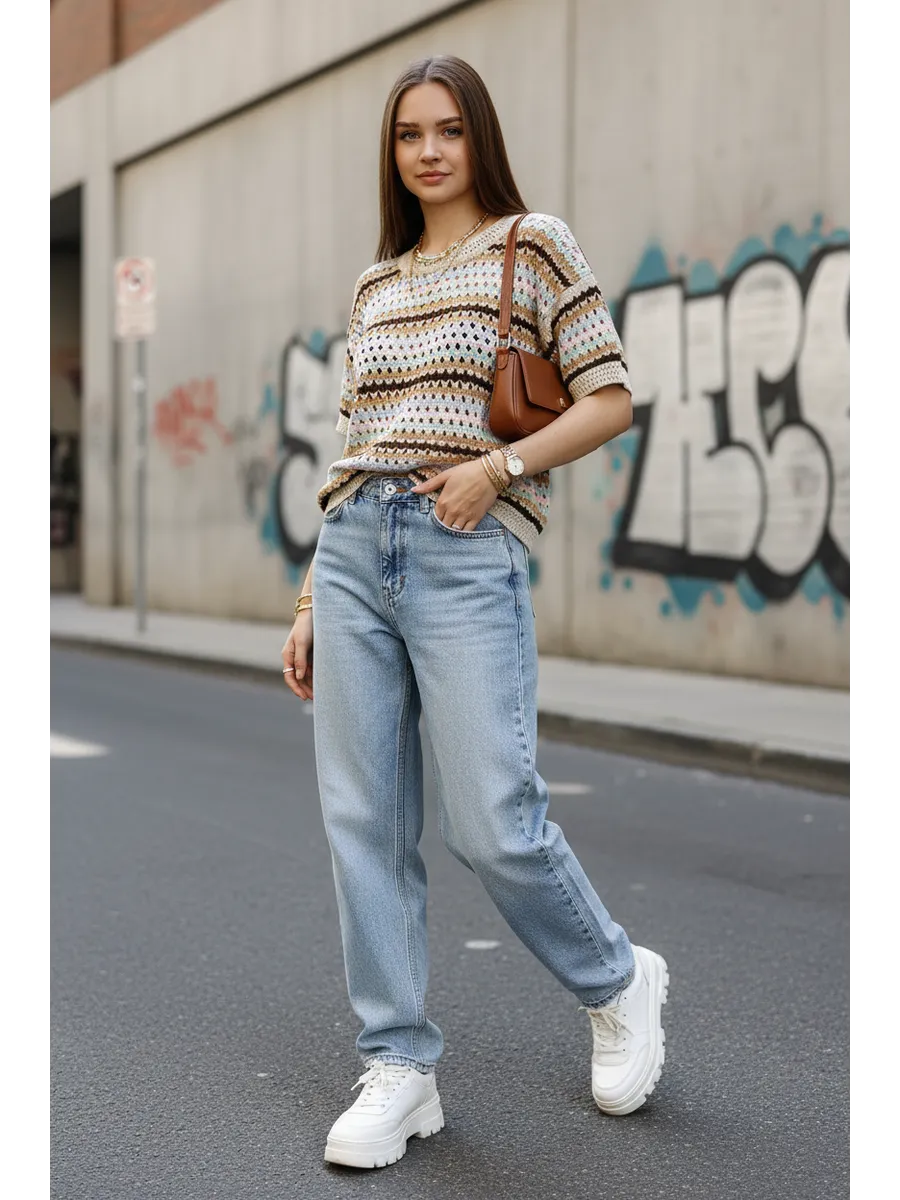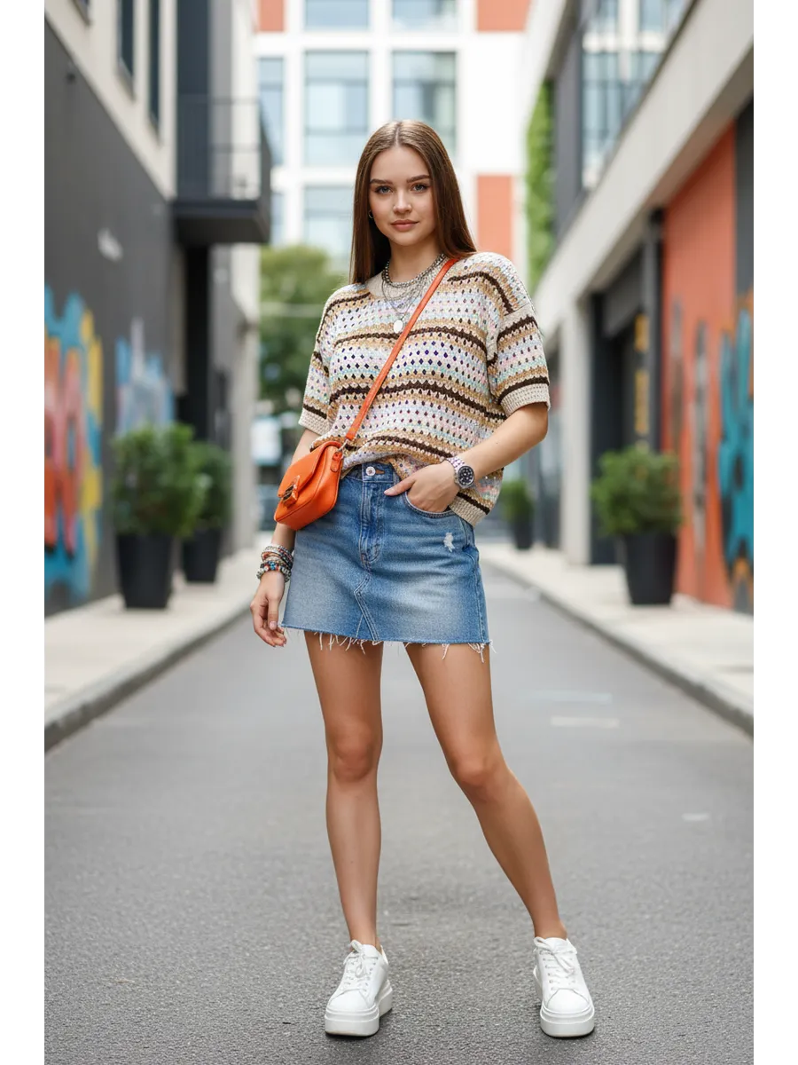 Наша вязаная модель отличается оригинальным принтом, который привлекает внимание. Ажурная текстура и детали в виде дырок создают игривый и современный образ. Свитер, выполненный в технике паутинка крупной вязки, отлично смотрится как в сочетании с юбкой, так и с джинсами. Полосатый узор добавляет изюминку, а оверсайз крой делает эту вещь подходящей для девушек-подростков, что делает её универсальной для любого стиля.