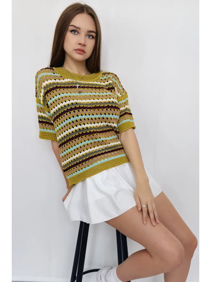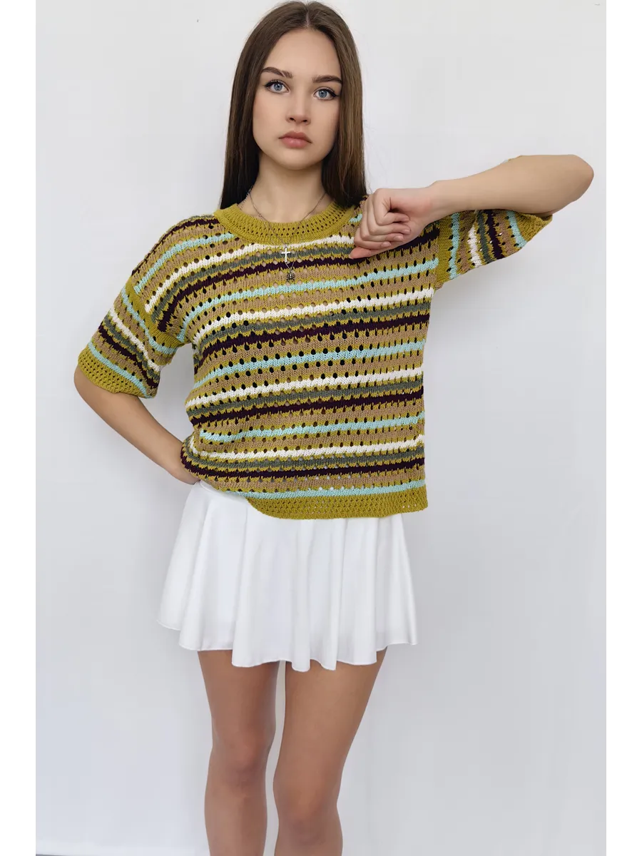 Наша вязаная модель отличается оригинальным принтом, который привлекает внимание. Ажурная текстура и детали в виде дырок создают игривый и современный образ. Свитер, выполненный в технике паутинка крупной вязки, отлично смотрится как в сочетании с юбкой, так и с джинсами. Полосатый узор добавляет изюминку, а оверсайз крой делает эту вещь подходящей для девушек-подростков, что делает её универсальной для любого стиля.