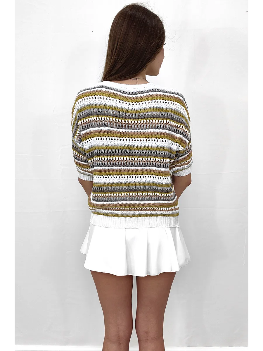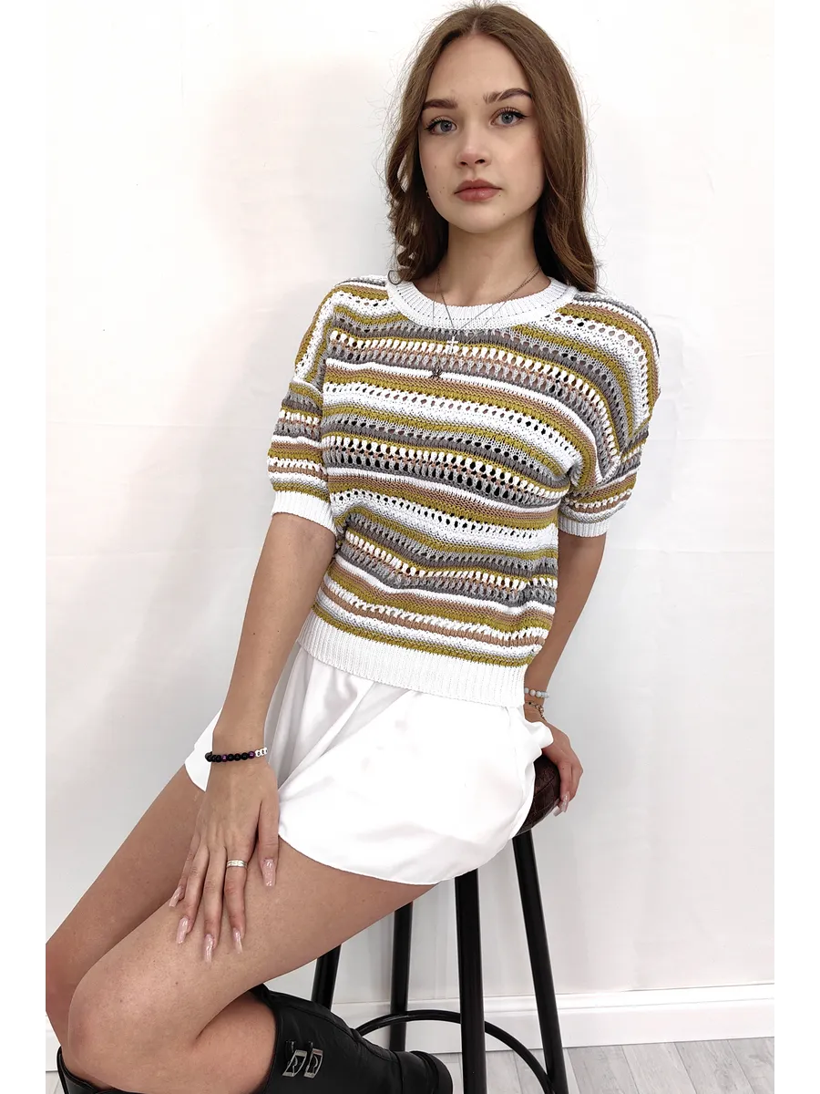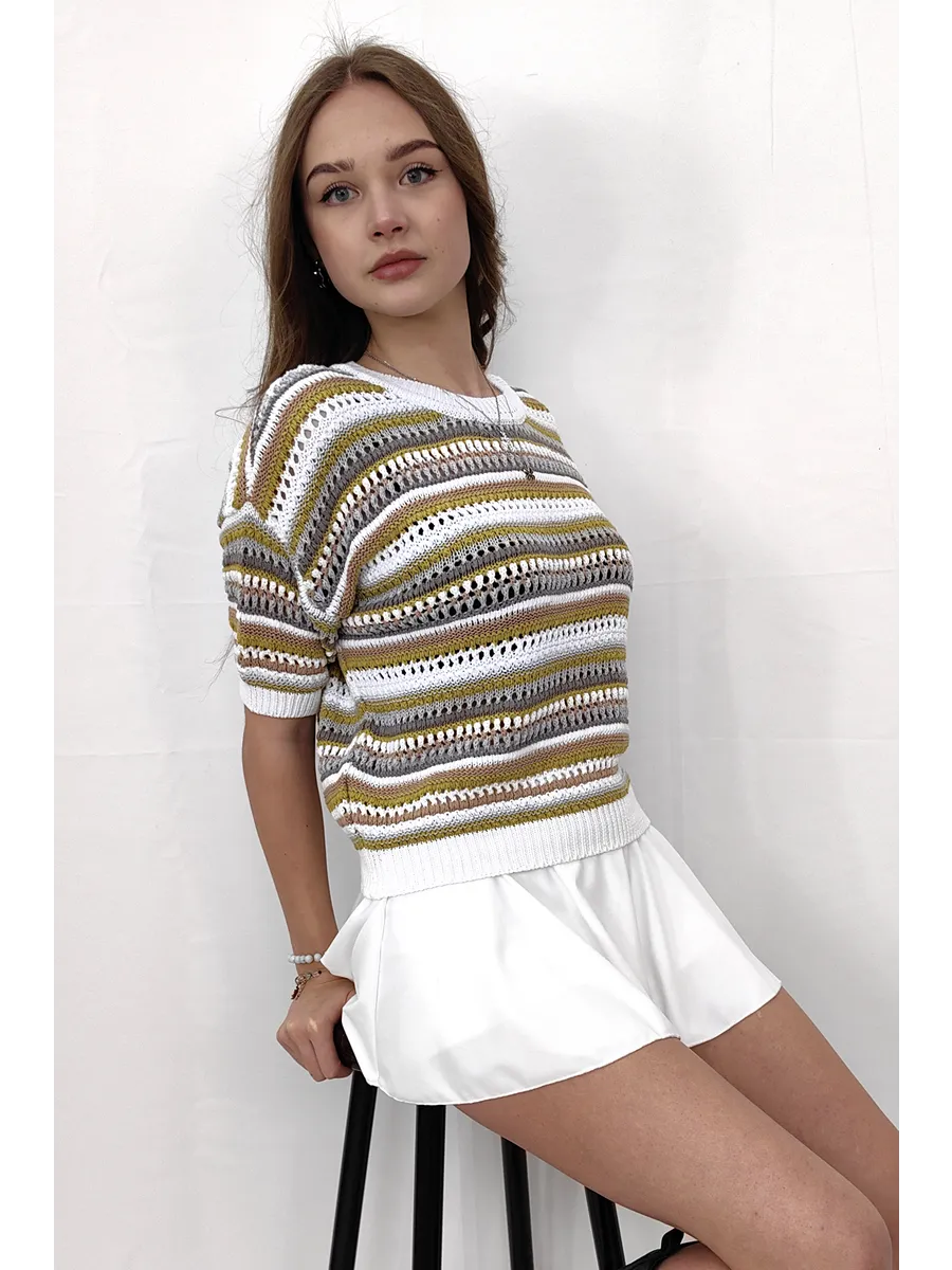 Наша вязаная модель отличается оригинальным принтом, который привлекает внимание. Ажурная текстура и детали в виде дырок создают игривый и современный образ. Свитер, выполненный в технике паутинка крупной вязки, отлично смотрится как в сочетании с юбкой, так и с джинсами. Полосатый узор добавляет изюминку, а оверсайз крой делает эту вещь подходящей для девушек-подростков, что делает её универсальной для любого стиля.