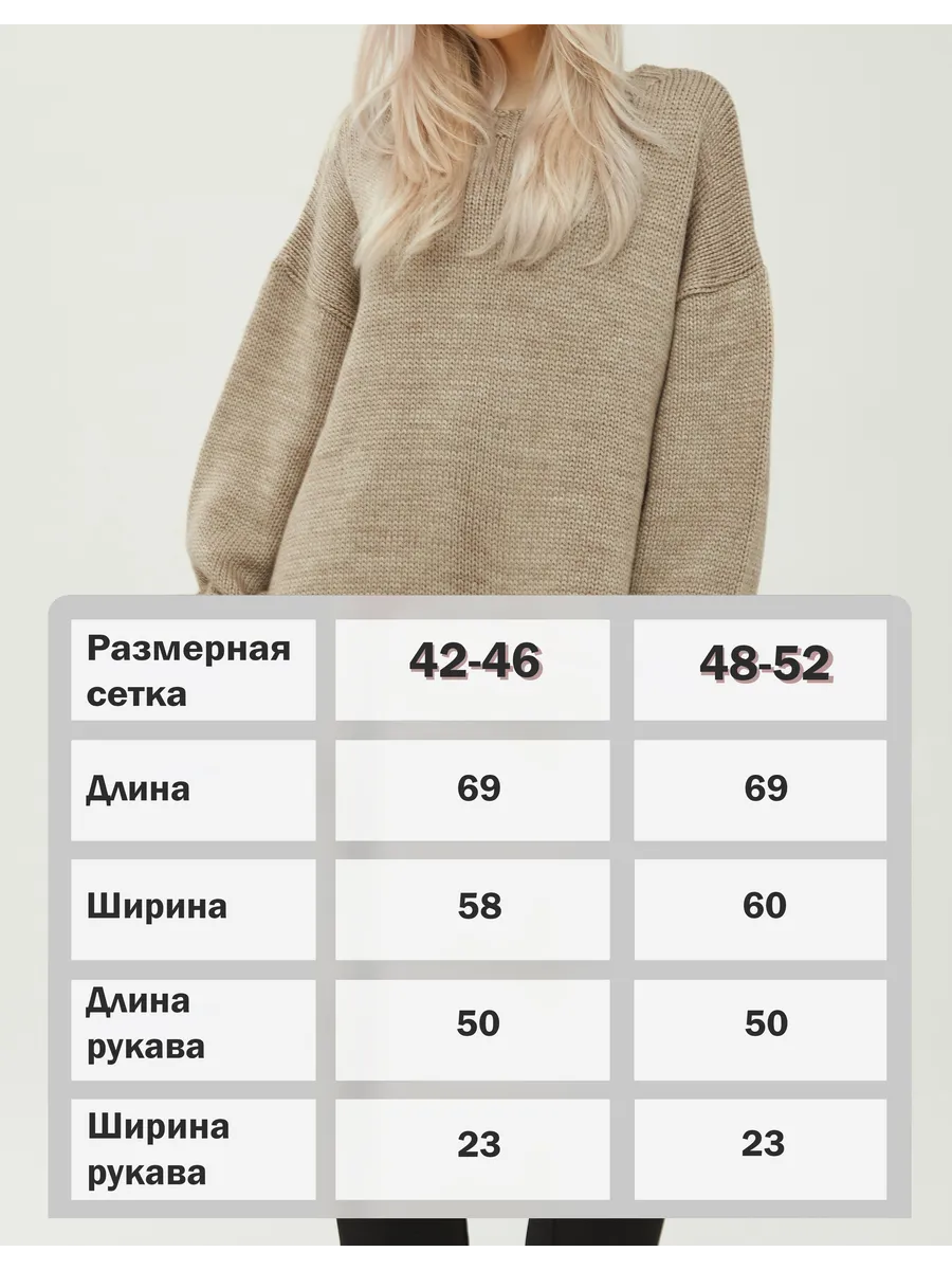 Удлиненный вязаный свитер крупной вязки с округлая горловина создан для зимних радужных вечеров с друзьями и долгих прогулок в осенний сезон. Объемный джемпер с горлом выглядит расслабленно, стильно, создавая комфорт и уют. Широкий крой, большой размер, свободный фасон оверсайз подходит для женщин любого возраста и комплекции, нравится подросткам и беременным. Женский шерстяной пуловер сохраняет мягкость. За счет акрила не мнется, сохраняет цвет и форму после многочисленных стирок. Длинный базовый свитшот украсит повседневный гардероб для женщин и девочек. Модный трикотажный джемпер заменит толстовку на молнии для спортивного образа с рваными джинсами и яркими леггинсами. Свободный оверсайз свитер больших размеров не сковывает, заменит худи подросткам. Уютный, теплый объемный джемпер с круглым горлом комфортный для повседневной носки даже летом, мягкий, при этом трикотажная кофта с длинным рукавом не мнется, держит форму, сохраняет цвет. Удлиненная модель смотрится как вязаное платье для невысоких и, как укороченный пуловер для высоких, подойдет беременным. Добавьте юбку в школьном стиле, платье с леопардовым принтом или короткие кожаные шорты. Заправьте в цветные брюки, накиньте пиджак на пуговицах и ловите восхищенные взгляды. Укутайтесь в мягкий свитер, как в любимый кардиган, или подарите в подарок сестре, маме, подруге. И пусть зима будет уютной и теплой. 1. модель рост 173см, 110-85-104, 2. модель рост - 166см, 89-61-92. На двух моделях одинаковый размер 42-46. Топик на модели Арт 431805597 шорты Арт 398920272